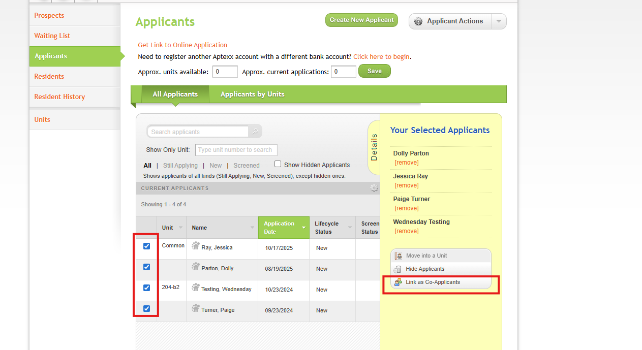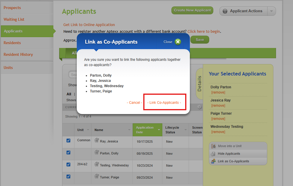 1. To link them you will click the checkbox of the applicants you wish to link >> select "Link as Co- Applicants"