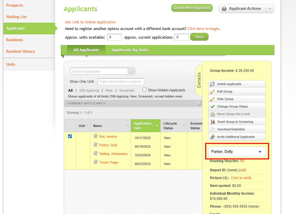 Once the applicants have submitted their application, you will have the option to link them together if they are going into the same unit. Submitted applications will show the Lifecycle Status as "New"