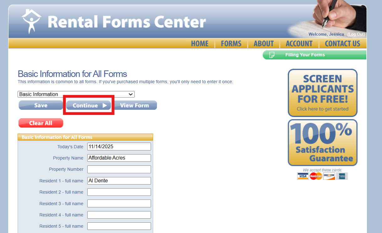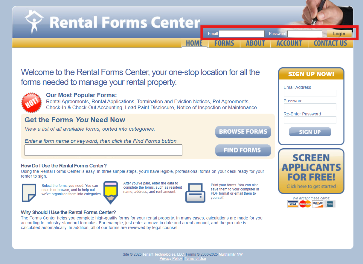 1. To access the form you have already purchased, you will need to ensure you are logged in to your Rental Forms Center account. If you are not logged in, you can login to your account by entering your login credentials at the top right of the page >> and click Login