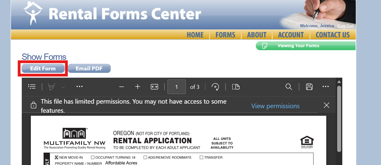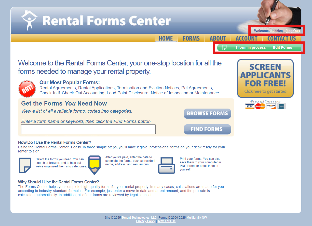 2. Once logged in, you will see your name in the top right corner- and a green box showing your Forms in Process. The forms purchased will only be available for electronic edit for 7 days after purchase. Then you will click Edit Forms