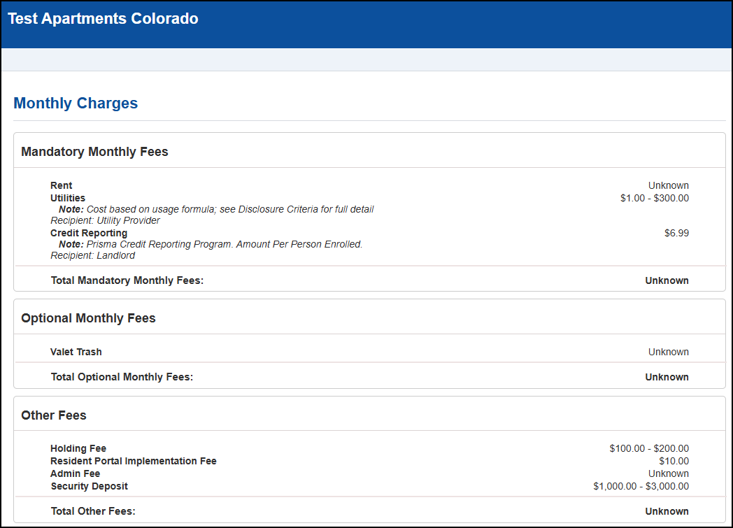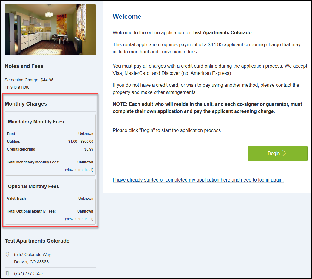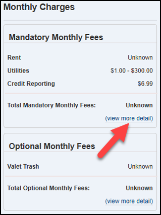 If a Property Management Company is using the feature, applicant's will see the disclosed monthly charges listed along the left side of the Online Application page.