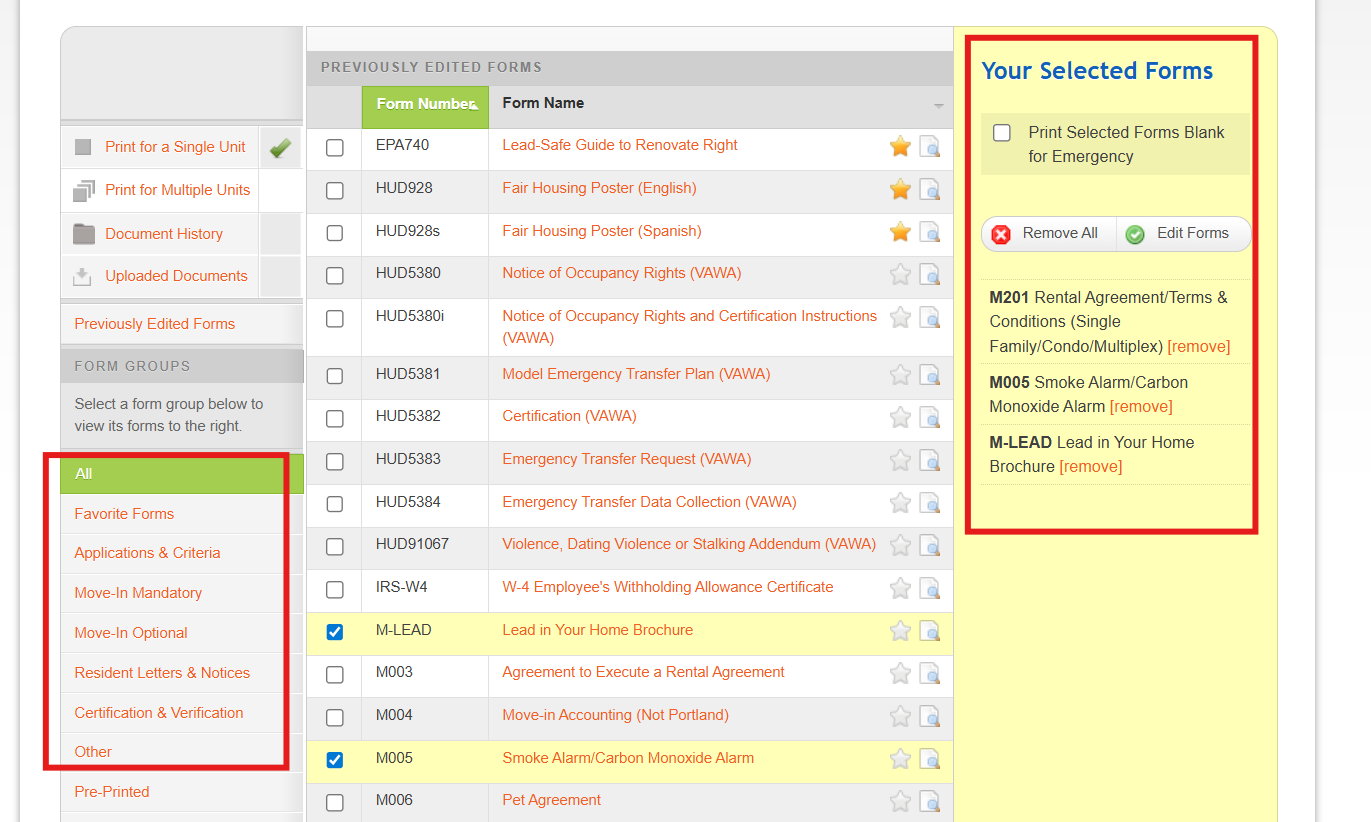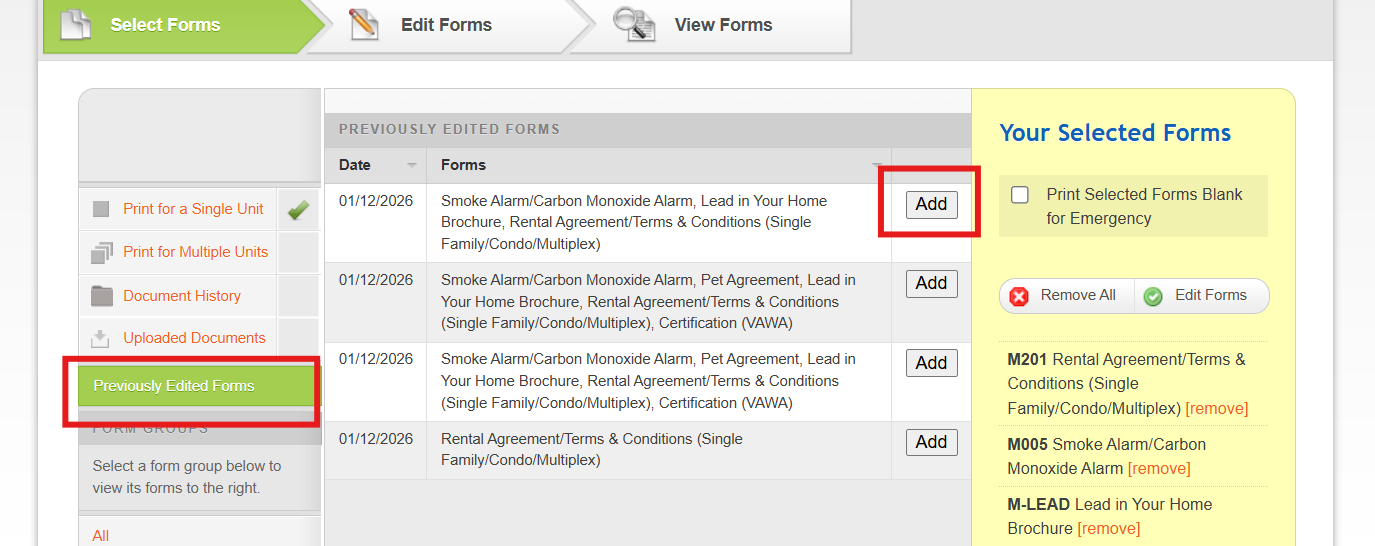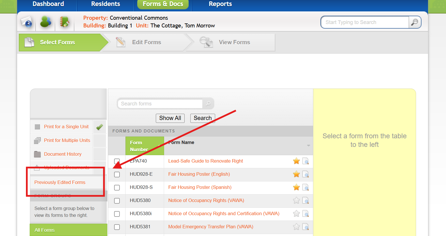 Step 2: Go to Forms & Docs → Select Print for a Single Unit → Select Previously Edited Forms.
