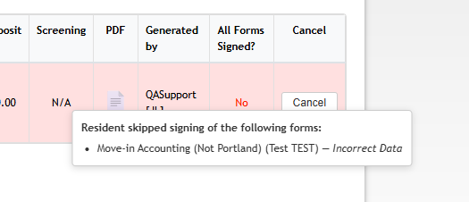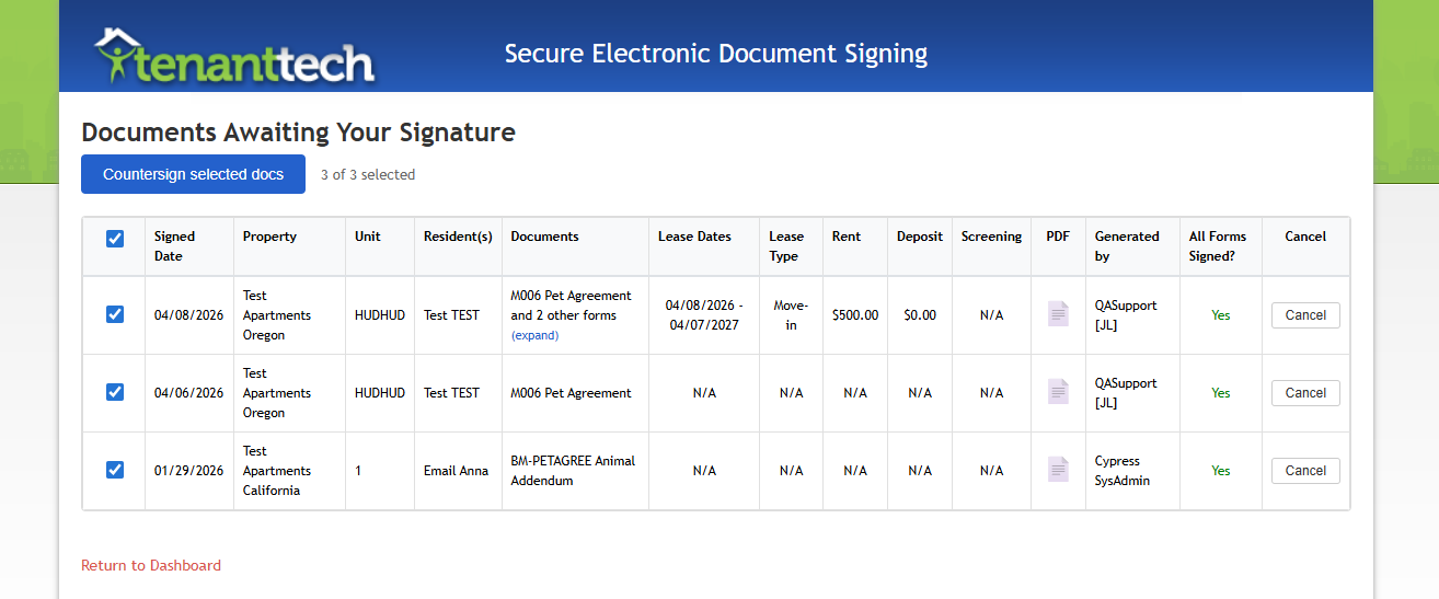 - Status indicators – Shows whether all required signatures are completed or if a resident has declined/cancelled a document signing