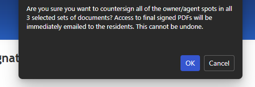 Step 3- Once users have selected the forms you wish to countersign, they will be prompted to confirm if they would like to move forward with applying their countersignature to the selected forms. Users should select OK to apply their signature to selected forms.