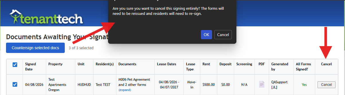 You can cancel a signing directly on this page as well. If you choose to cancel a signing from here, the documents will need to be regenerated, and reissued for electronic signature. This will cancel the document entirely.